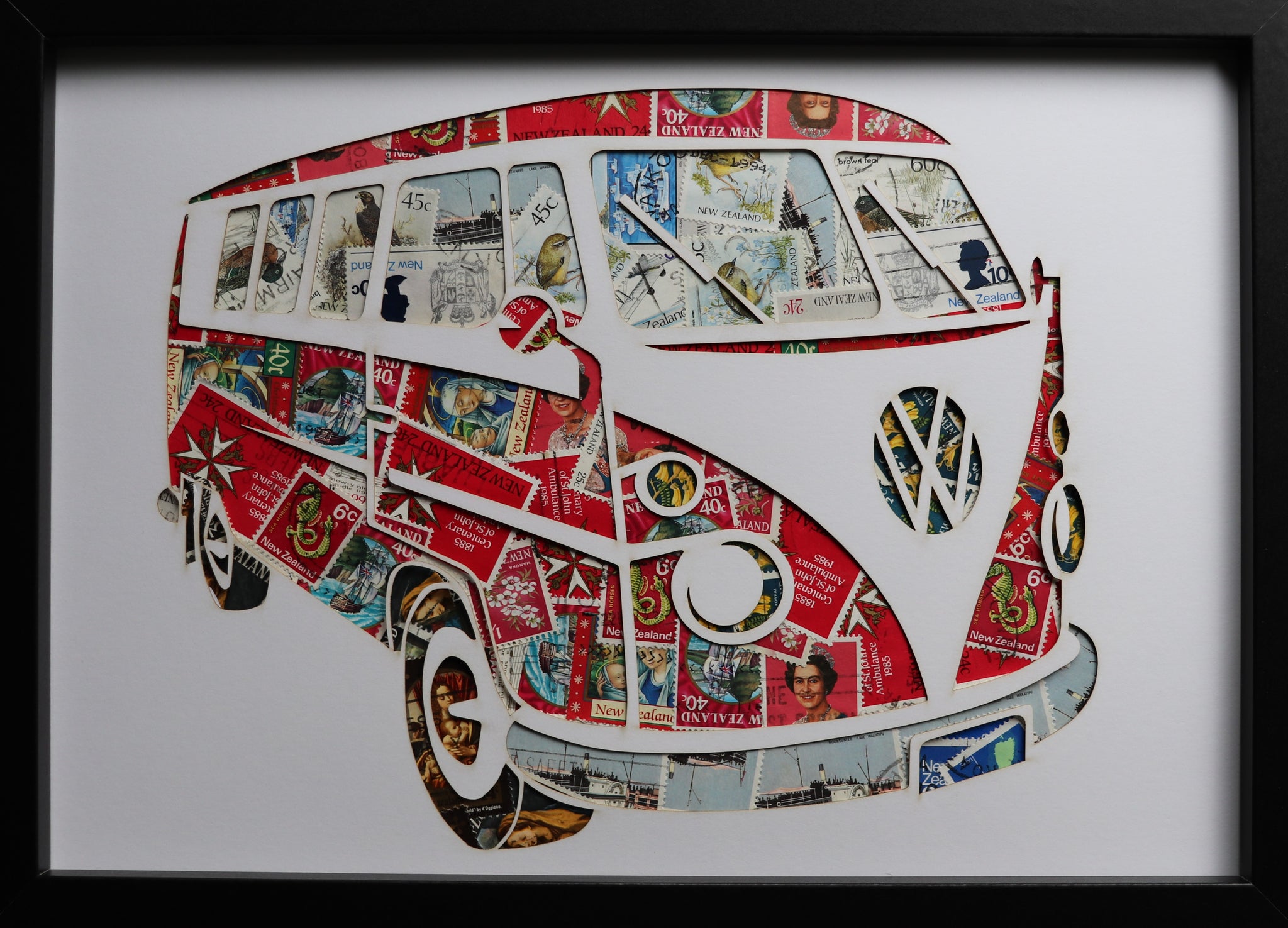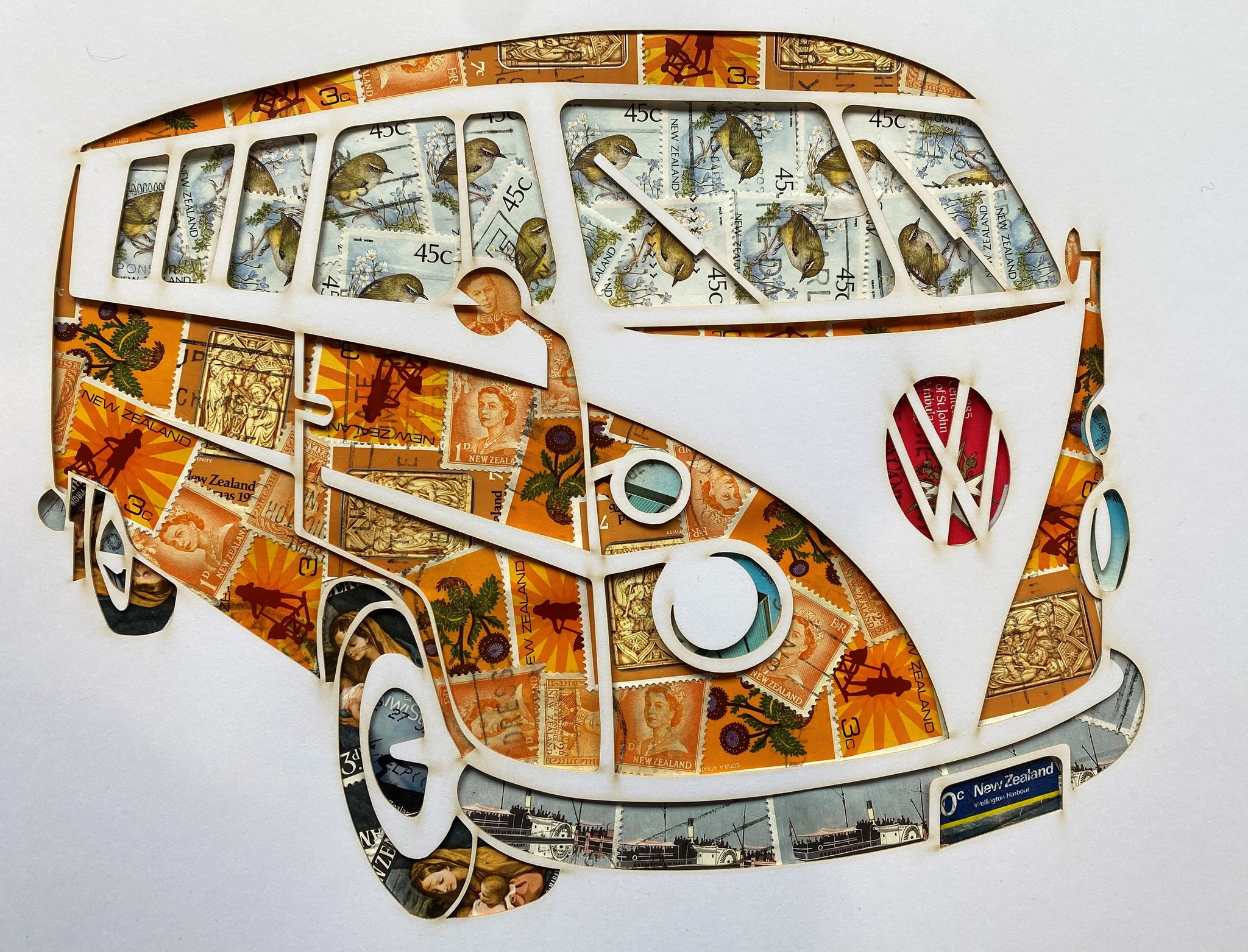 This A4 size art piece is a made from a collage of real vintage New Zealand postage stamps behind a card stencil to create a unique piece of Kiwiana Art!